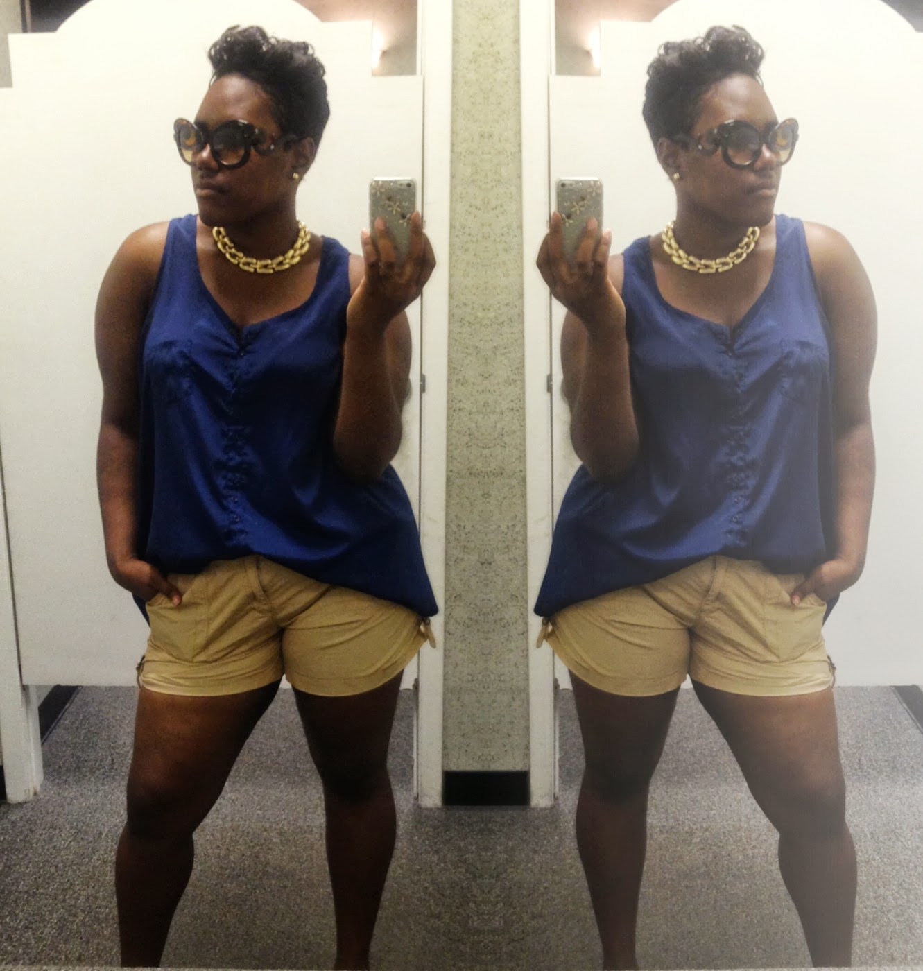 Right now it is all about mixing and matching more dressed pieces with casual ones to keep comfortable during the heat I will even use my outfit for example. Here I have on a navy sleeveless blouse with the front tucked into my more casual cargo shorts. I paired it with my heavy gold plated necklace and gold stud earrings to keep the look more chic because I was going to work.