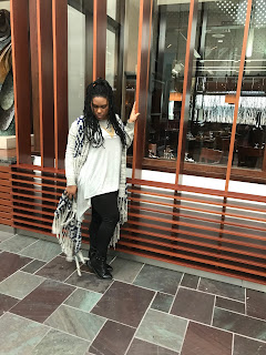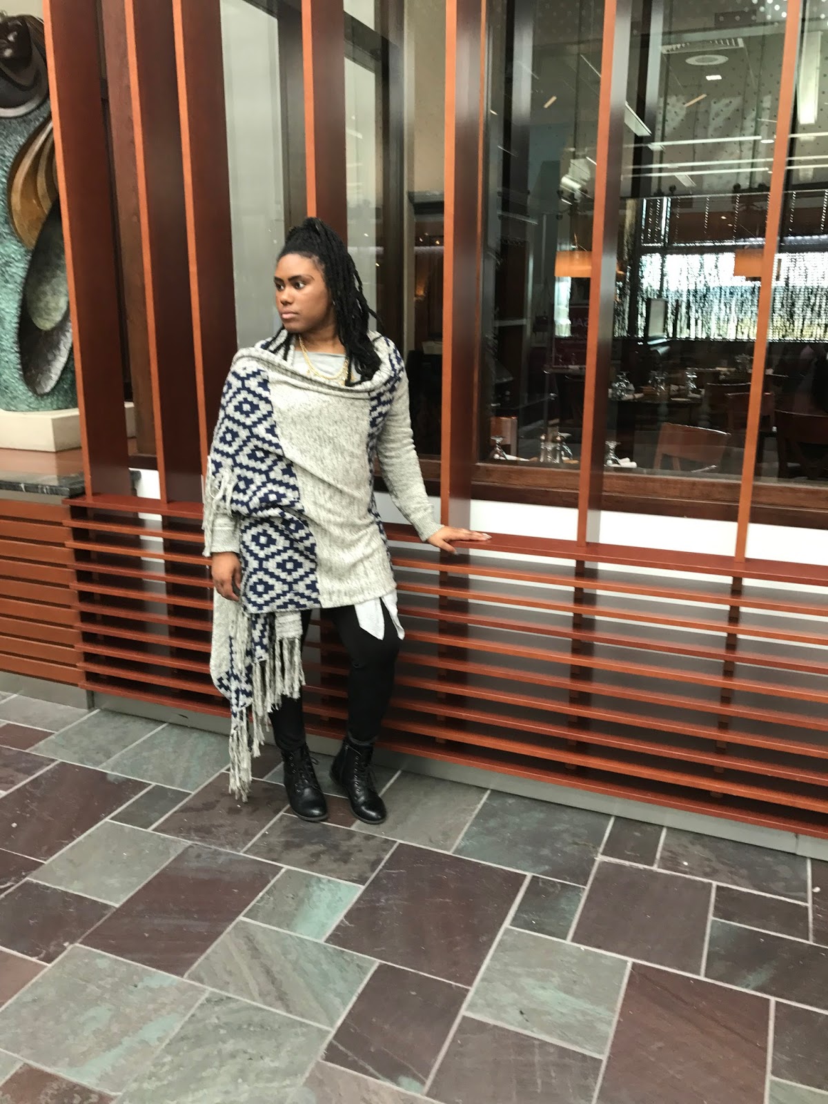 As seen here I have on grey and navy tribal sweater that is just every bit of fabulous as it is warm.